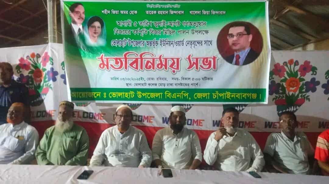 চাঁপাইনবাবগঞ্জের ভোলাহাট উপজেলা বিএনপির আয়োজনে ৩ আগস্ট ২০২৫ তারিখে বিকেল ৫টায় ভোলাহাট কলেজ মোড় ঢাকা বাস স্ট্যান্ডের পাশে আগামী ৫ ই জুলাই – আগষ্ট গন অভ্যুত্থান বিজয়ের বর্ষ পূর্তি বিজয় মিছিল পালন উপলক্ষে ভোলাহাট উপজেলার অন্তর্ভুক্ত ইউনিয়ন ও ওয়ার্ডের নেতৃবৃন্দের সাথে মত বিনিময় সভা অনুষ্ঠিত হয়।ভোলাহাট উপজেলা শাখা বিএনপি সভাপতি মোঃ ইয়াজ দানি আলিম আল রাজি জর্জ এর সভাপতিত্বে উপস্থিত ছিলেন, উপজেলা বিএনপির সাধারণ সম্পাদক মোঃ আব্দুল কাদের উপজেলা বিএনপির নির্বাহী সদস্য মোঃ মোজাম্মেল হক চুটু উপজেলার বিএনপির সাংগঠনিক সম্পাদক মোঃ জহুরুল হক ২নং গোহালবাড়ি ইউনিয়ন বিএনপির সভাপতি মোঃ রহমত উল্লাহ,সাধারণ সম্পাদক আব্দুল রাকিব