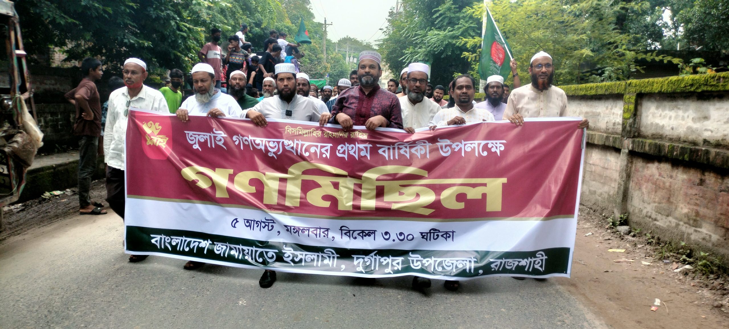 জুলাই গণঅভ্যুত্থানের প্রথম বার্ষিকী উপলক্ষে রাজশাহীর দুর্গাপুর উপজেলায় এক বর্ণাঢ্য গণমিছিলের আয়োজন করা হয়। আজ দুপুরে দুর্গাপুর উপজেলা জামায়াতের উদ্যোগে এ মিছিল অনুষ্ঠিত হয়।