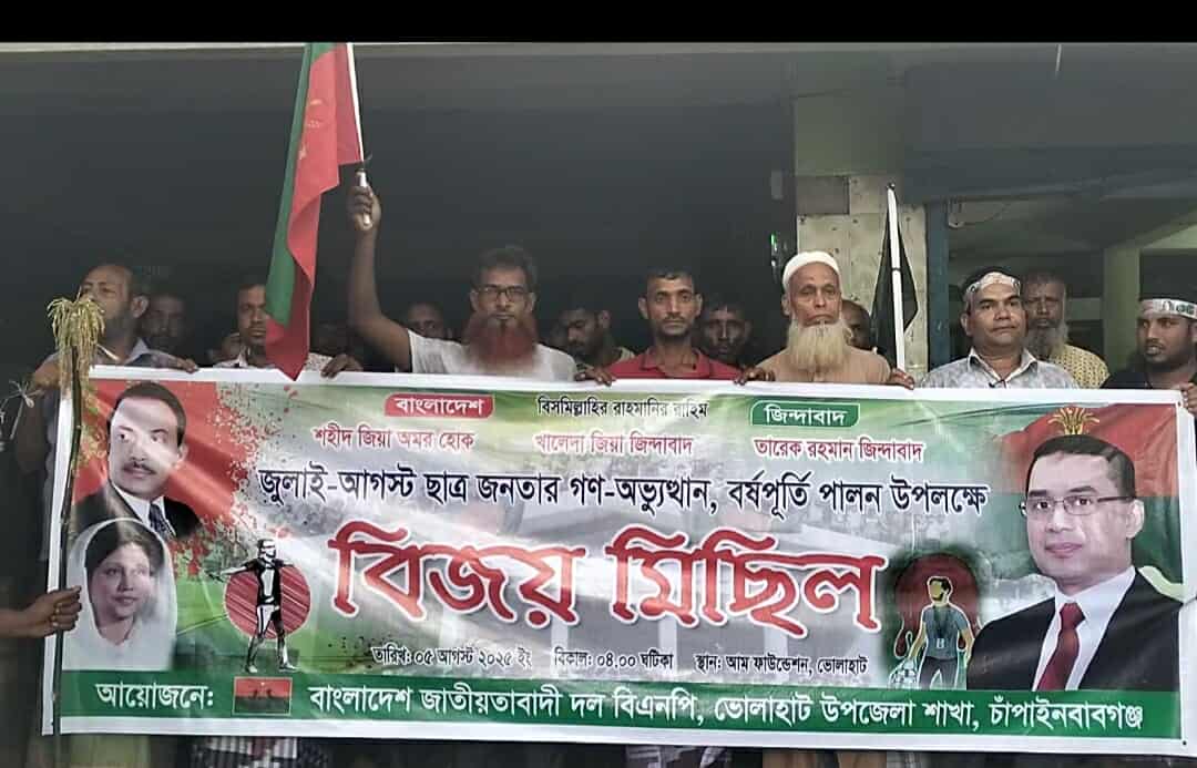 চাঁপাইনবাবগঞ্জ ভোলাহাট উপজেলা বিএনপি ‘র আয়োজনে জুলাই আগস্ট অভ্যুত্থানের বিজয়ের বর্ষপূর্তি পালন উপলক্ষে আম ফাউন্ডেশন সংলগ্ন পার্টি অফিস থেকে শুরু করে উপজেলার বিভিন্ন এলাকা ঘুরে উপজেলা মেন গেটে উপস্থিত হয়ে বিজয় মিছিলের আলোচনা অনুষ্ঠিত হয়েছে।৫ইআগষ্ট মঙ্গলবার বিকেল ৪ টার সময় উপজেলা বিএনপির সভাপতি মোঃ কাওসারুল ইসলাম রন্জূর সভাপতিত্বে উপস্থিত ছিলেন উপজেলা বিএনপির সিনিয়র সহ-সভাপতি খিজির হায়াত মোল্লা , উপজেলা বিএনপির সাধারণ সম্পাদক আব্দুল মান্নান, উপজেলা বিএনপির যুগ্ম সাধারণ সম্পাদক মোঃ কামরুজ্জামান মানিক, উপজেলা বিএনপির সহ-সভাপতি মোঃ সারওয়ারদি , উপজেলা বিএনপির যুগ্ম সাধারণ সম্পাদক মোঃ আশরাফুল হক , উপজেলা বিএনপির সাংগঠনিক সম্পাদক মোঃ শহিদুল্লাহ সহ অংগ সংগঠনের নেতাকর্মীরা ও ধানের শীষের ভোটারগণ উপস্থিত ছিলেন।