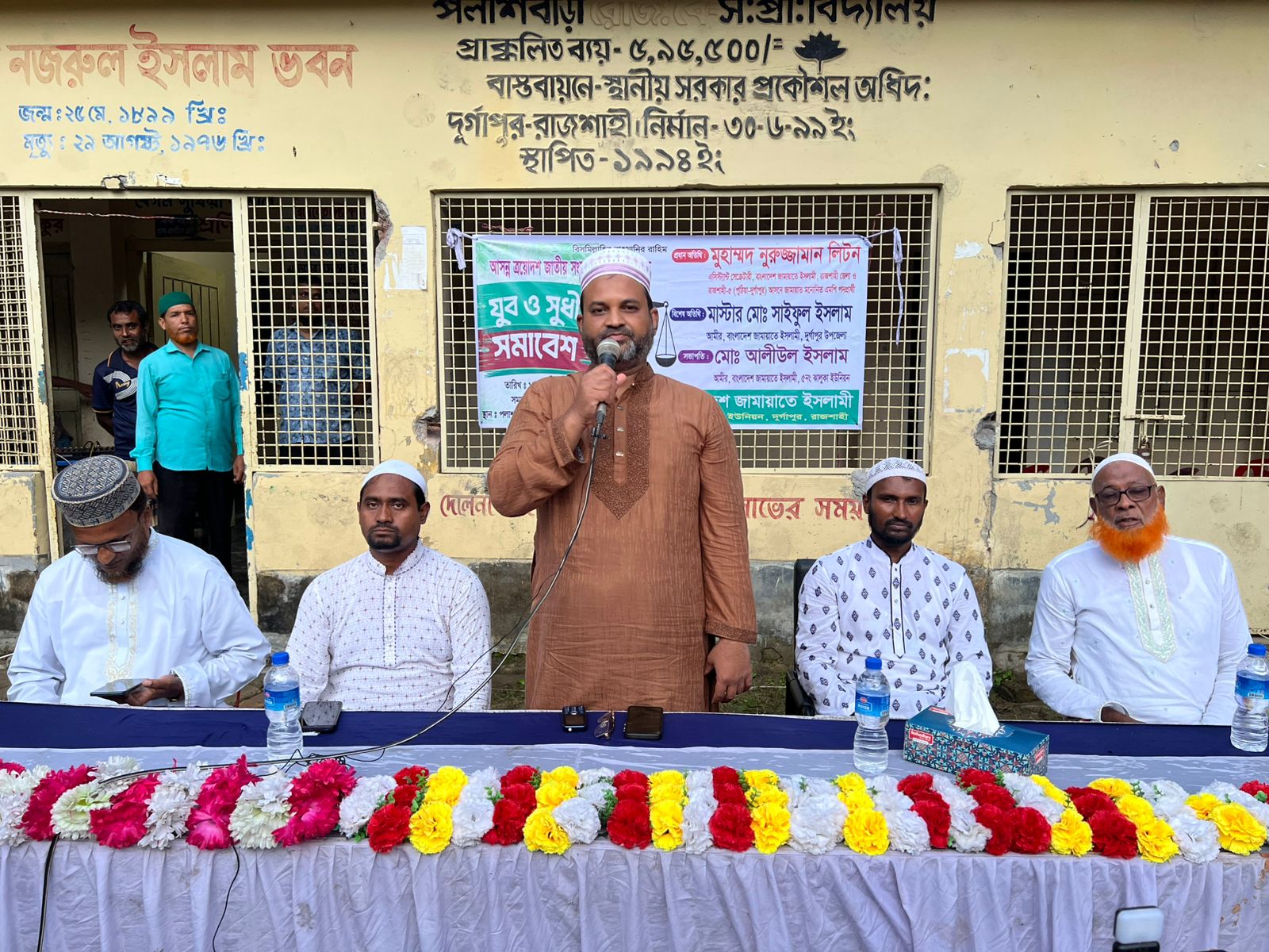 আসন্ন ত্রয়োদশ জাতীয় সংসদ নির্বাচনকে সামনে রেখে আজ মঙ্গলবার বিকেল ৫টা ১৫ মিনিটে রাজশাহীর দুর্গাপুর উপজেলার পলাশবাড়ি সরকারি প্রাথমিক বিদ্যালয় মাঠে বাংলাদেশ জামায়াতে ইসলামীর উদ্যোগে এক যুব ও সুধী সমাবেশ অনুষ্ঠিত হয়।
