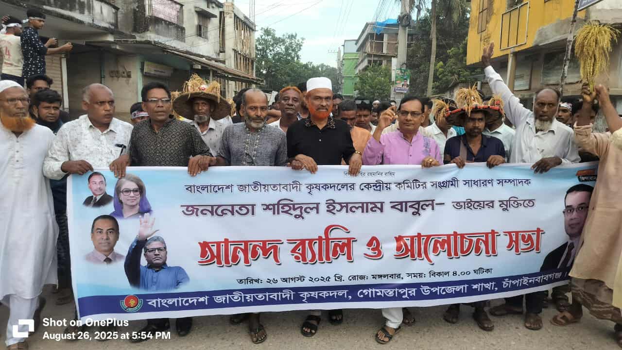 বাংলাদেশ জাতীয়তাবাদী কৃষকদলের কেন্দ্রীয় কমিটির সাধারণ সম্পাদক শহিদুল ইসলাম বাবুলের মুক্তিতে চাঁপাইনবাবগঞ্জের গোমস্তাপুরে কৃষকদল আনন্দ র্যালি ও আলোচনা করেছে।