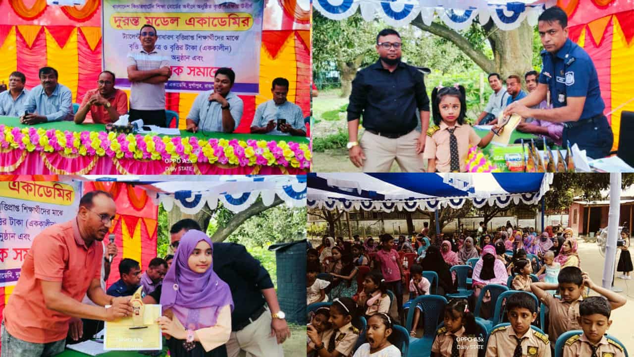 ২০২৪ সালের বাংলাদেশ কিন্ডার গার্ডেন সোসাইটি অ্যাসোসিয়েশনের অধীন দুর্গাপুর উপজেলার ৬ টি কেজি স্কুলের মোট ৯৪ জন শিক্ষার্থী বৃত্তি পরীক্ষা অংশগ্রহণ করেন, এতে ৯টি ট্যালেন্টপুলে ও ১৫ টি সাধারণ গ্রেডে বৃত্তি প্রদান করা হয়, তার মধ্যে দুরন্ত মডেল একাডেমির ৭ টি ট্যালেন্টপুলে ও ২টি সাধারণ গ্রেডে বৃত্তি অর্জন করে। বক্তব্য শেষে বৃত্তিপ্রাপ্ত শিক্ষার্থীদের মধ্যে সনদপত্র, বৃত্তির টাকা (এককালীন) ও ক্রেস্ট বিতরণ করা হয়, ৫ ই আগস্ট চিত্রাঙ্গন প্রতিযোগিতায় অংশগ্রহণকারী তিনটি বিভাগের প্রথম দ্বিতীয় ও তৃতীয়র মাঝে পুরস্কার বিতরণ করা হয়, সবশেষে সভাপতি অনুষ্ঠানটি সমাপ্তি ঘোষণা করেন।