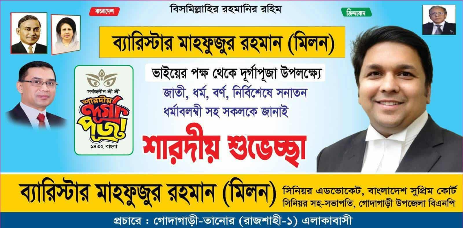 শারদীয় দূর্গা পূজা উপলক্ষে মনোনয়ন প্রত্যাশী ব্যারিস্টার মিলনের শুভেচ্ছা বার্তা
